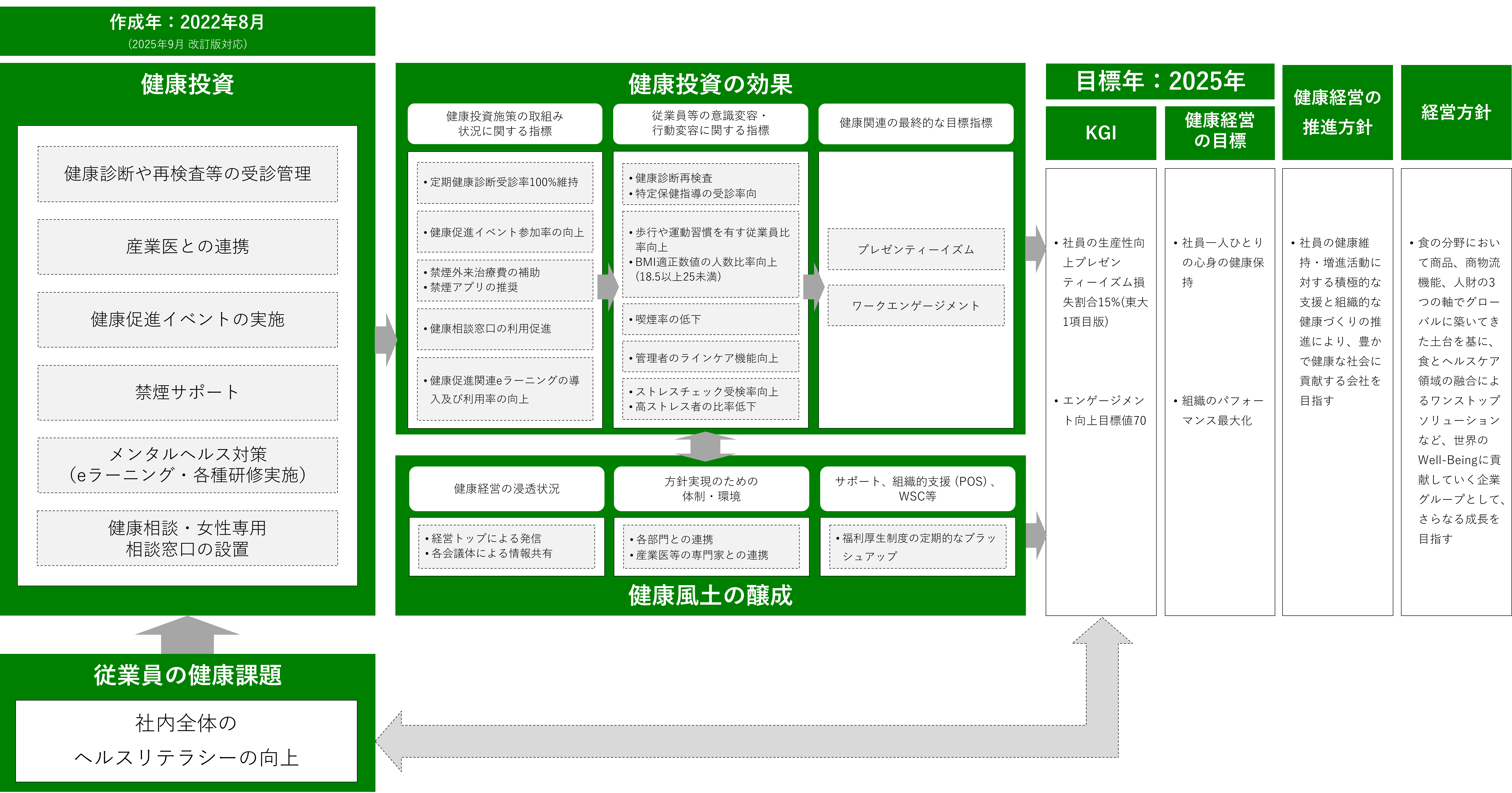 当社は、社員の健康を重要な経営資源の一つと捉え、社員の健康維持・増進活動に対する積極的な支援と組織的な健康づくりの推進により、豊かで健康な社会に貢献する会社を目指すことを宣言します。